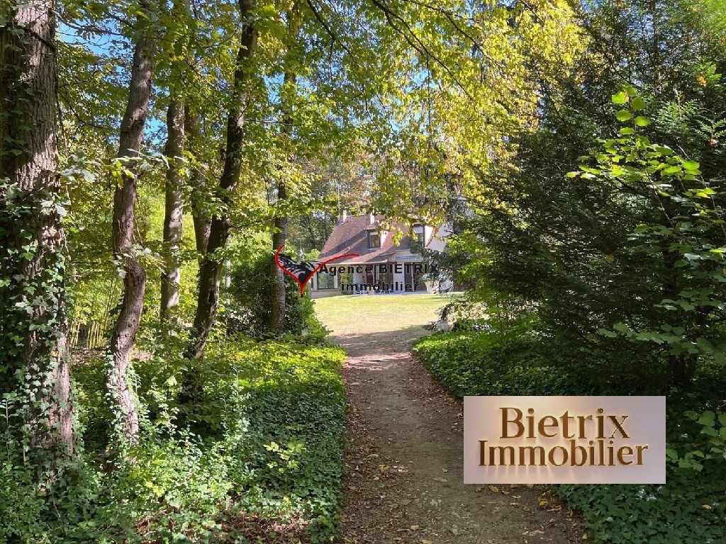 l'Isle-Adam: à 2 km du centre ville, au calme sans aucun vis à vis, en lisière de forêt, superbe villa traditionnelle des années 1990 de 192 m² utile comp: une entrée, cuisine américaine équipée avec coin repas, double salon avec cheminée et baie vitrée, 2 chambres, salle d'eau, wc, à l'étage bureau mezzanine, 3 chambres, salle de bains balnéo avec douche , wc, climatisation, chauf central fuel, sous-sol total avec garage 4 voitures, atelier, parc clos et arboré de 7000 m². Idéal pour les passionnés des chevaux . d'infos sur www.bietrix.com
