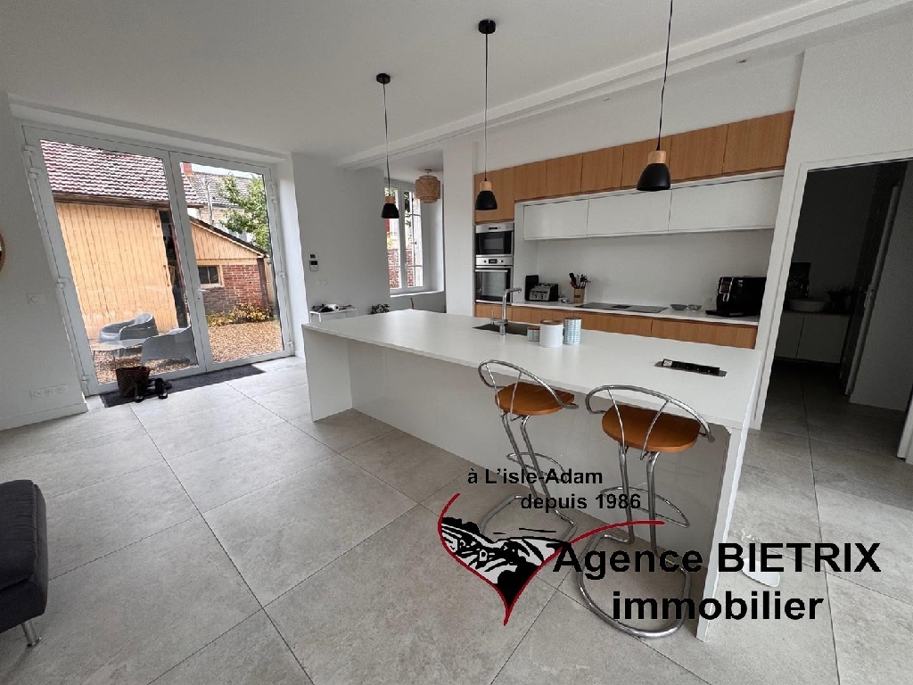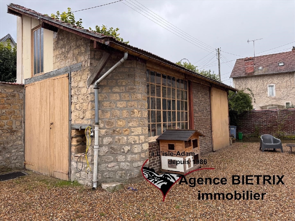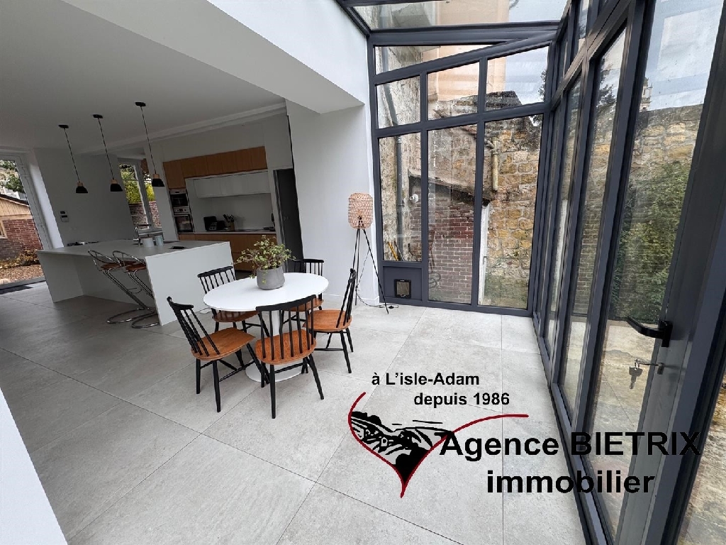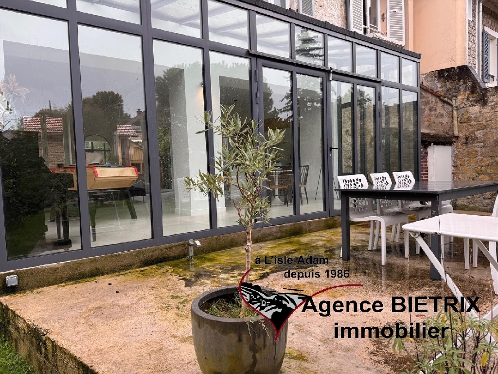 l'Isle-Adam: notre cadre de vie est exceptionnel en étant en région parisienne, au centre ville, au calme, maison en pierre lumineuse du début 1900 et surtout l'intérieur est restauré, les baies vitrées et verrière donne un petit côté moderne comprenant : Une entrée, une cuisine américaine équipée donnant sur un grand séjour triple avec un verrière et terrasse, un wc, une arrière cuisine, à l'étage palier desservant 3 chambres, une salle d'eau avec wc, une salle de bains et dressing, à l'étage 2 chambres, une salle d'eau avec wc, une cave voutée, un grand garage indépendant 30 m² avec abri de jardin, terrain de 780 m² environ.